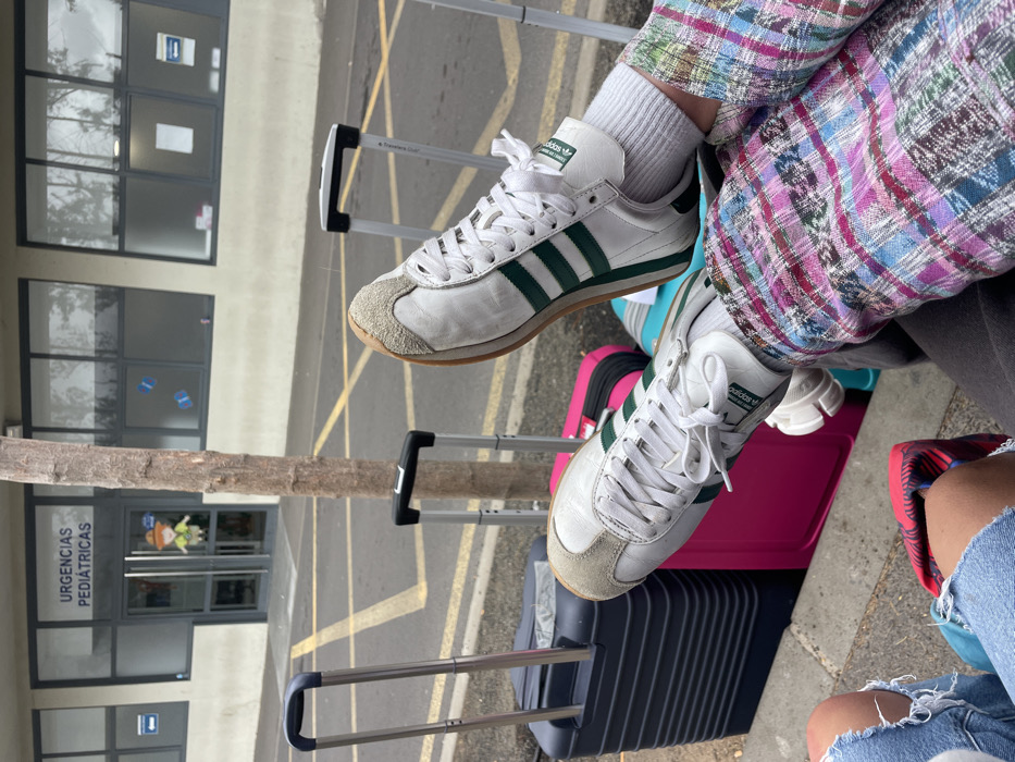 pair of white sneakers with green stripes. The shoes are being worn by a person, who is wearing blue jeans, and a colorful plaid shirt. The person's right foot is resting on a pink and blue suitcase, while the person's left foot is resting on a blue suitcase. The person is sitting outside of a building in Arona, Spain (latitude: 28.069, longitude: -16.705). The building has a sign that reads "URGENCIAS PEDIATRICAS" on the front. The ground is a mix of pavement and concrete.