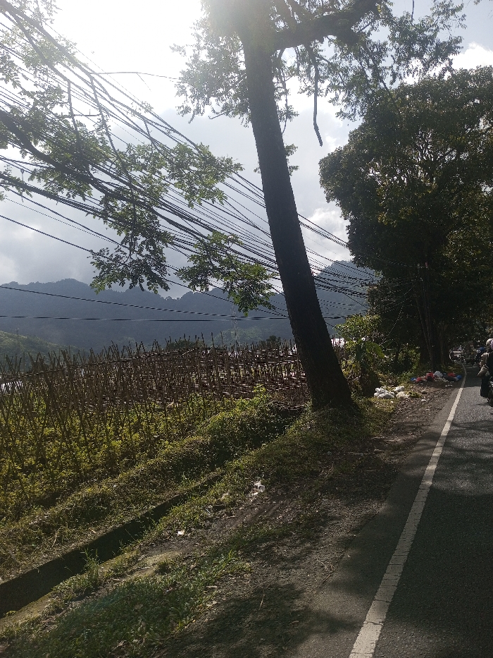 The image displays a roadside scene in Kandapola, Sri Lanka, illuminated by bright sunlight originating from the upper-left, casting distinct shadows. In the foreground, a dark asphalt road features a solid white line marking its edge and a broken white centerline partially visible. The road extends from the lower-right towards the upper-right. To the immediate left of the road, a steep, grassy embankment descends, featuring a narrow, dark drainage trench at its base. Further down this slope, a horizontally constructed fence made of numerous thin, dark wooden or bamboo stakes extends across the mid-ground, enclosing an area of light green vegetation. Beyond this, a valley transitions to a range of dark, multi-ridged mountains in the distant background, set against a partially cloudy sky. On the right side of the road, a prominent, dark-barked tree stands upright, slightly leaning right, with branches extending leftward, covered in green foliage. Adjacent to this, further right, a dense canopy of additional dark green trees and bushes lines the roadside. Numerous dark utility lines are strung horizontally and diagonally across the upper-left and mid-left sky, some passing through the tree canopy. Near the base of the trees on the right-hand dirt shoulder, several white plastic bags and other refuse are visible. In the far background on the right, partially obscured by trees, multiple individuals and at least one motorcycle are discernible on or near the road.