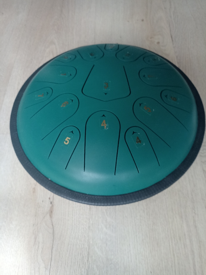 - "A teal-colored tongue drum is depicted resting on a light-colored wooden floor in Budva, Montenegro" by FM-7wfYm1, licensed under CC BY 4.0