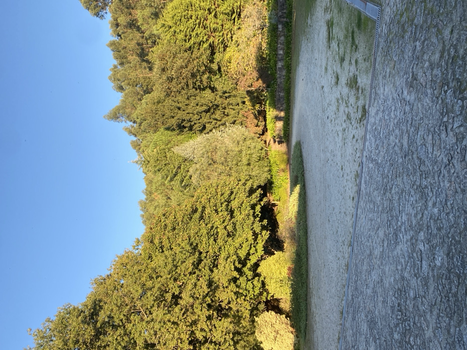 The image displays an outdoor scene within a park or garden in Ponte de Lima, Portugal, captured under clear blue skies with warm, directional sunlight indicative of late afternoon or early morning. In the immediate foreground, a textured grey stone pavement composed of irregular, flat stones extends across the lower portion of the frame. This pavement transitions via a narrow metal drainage grate to a lighter-colored, possibly sandy or very sparsely grassed area. Within this lighter ground, a distinct crescent-shaped patch of denser, short green vegetation is visible. The midground is dominated by a variety of trees and shrubs. On the left, large deciduous trees with vibrant green leaves are heavily illuminated by the sun. Towards the center and right, a diverse collection of trees, including tall conifers and other dense foliage, forms a verdant backdrop. A low, grey stone wall runs along the right side of the lighter ground area. A subtle dirt path appears to curve into the dense vegetation in the mid-right. The background consists of a dense forest or wooded hillside, extending upwards, composed of numerous trees of varying heights and species, including evergreens and some with lighter-toned foliage, all under the clear blue sky. No individuals or active subjects are present in the scene.