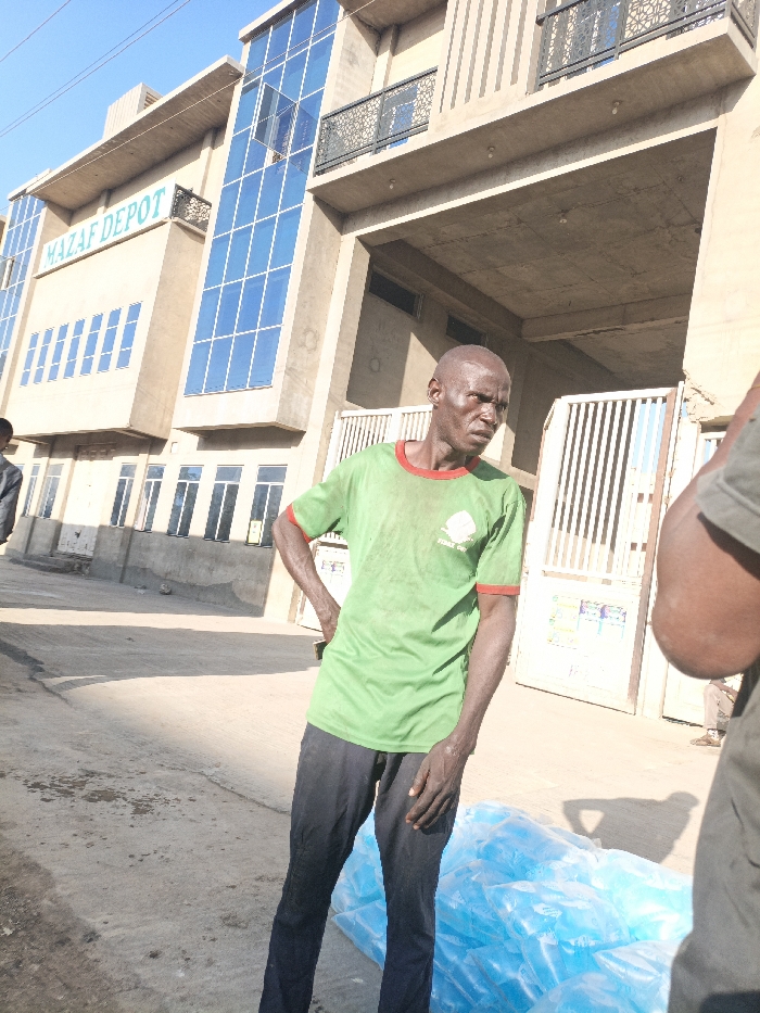 A man with a shaved head, wearing a green and red t-shirt and dark trousers, stands with his hand on his hip. Behind him is a pile of blue bags. The building "MAZAF DEPOT" is visible in the background, featuring blue-tinted windows and balconies. A person is partially visible to the right, and another figure is blurred on the left. The setting seems to be an outdoor urban area.