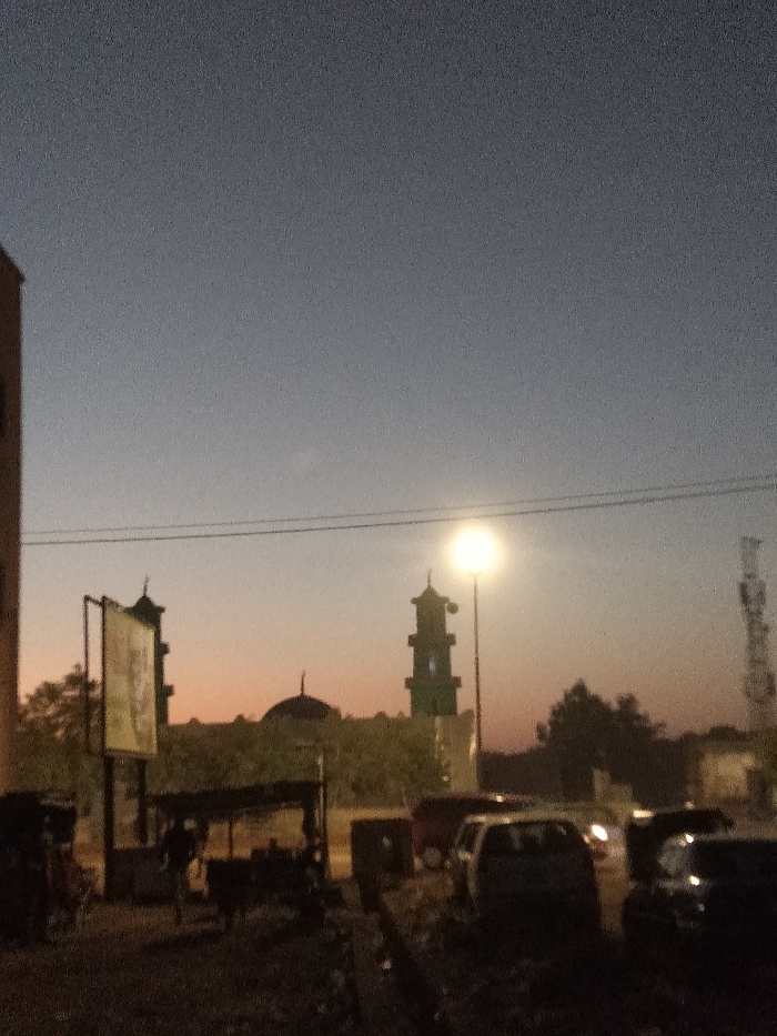 A dimly lit street scene at dusk. A mosque with a minaret and dome stands in the background, partly obscured by trees. A bright street lamp illuminates the area. Several vehicles are parked along the road. A roadside stall or cart is visible in the foreground, near a large billboard. The sky transitions from a light orange near the horizon to a darker blue above.