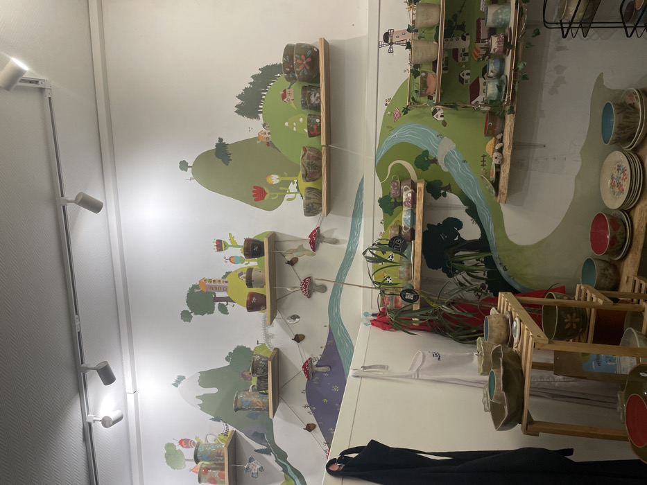 A wall display shows a whimsical mural depicting a countryside scene with green hills, trees, and a river. Shelves attached to the mural showcase ceramic mugs, bowls, and plates. The foreground features wooden racks displaying additional pottery. A black apron hangs below, near a white shirt and plant. Track lighting is visible on the ceiling.