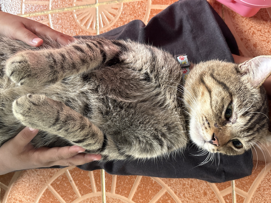 - "light brown domestic short-haired tabby cat with dark stripes lying on its back, held by two human hands" by FM-2HdLF2, licensed under CC BY 4.0