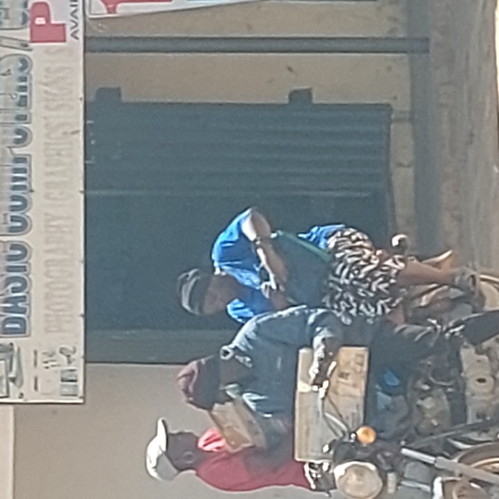 In Kuru Karama, Nigeria, a daylight scene unfolds on a street in front of a building featuring a dark, closed corrugated metal door. Above the door, a sign partially reads "BASIC COMPUTERS / CH..." and "PHOTOGRAPHY GRAPHICS SIGNS". A male individual, wearing a dark cap, dark blue/grey shirt, and dark trousers, is seated on a motorcycle. Two light-colored, rectangular packages are strapped to the front of the motorcycle, and he holds another similar package between his left arm and torso. A female passenger, wearing a blue top, patterned skirt, and dark headwrap, is seated behind him, appearing to handle a dark bag or object. To the left of the motorcycle, a third individual, a female wearing a red top and white baseball cap, stands. She holds a light-colored, rectangular package, seemingly in the process of transferring it to or receiving it from the motorcycle driver. The motorcycle itself is light-colored, with visible engine components and a single round headlight. The ground is a light-colored surface, possibly dirt or unpaved road.