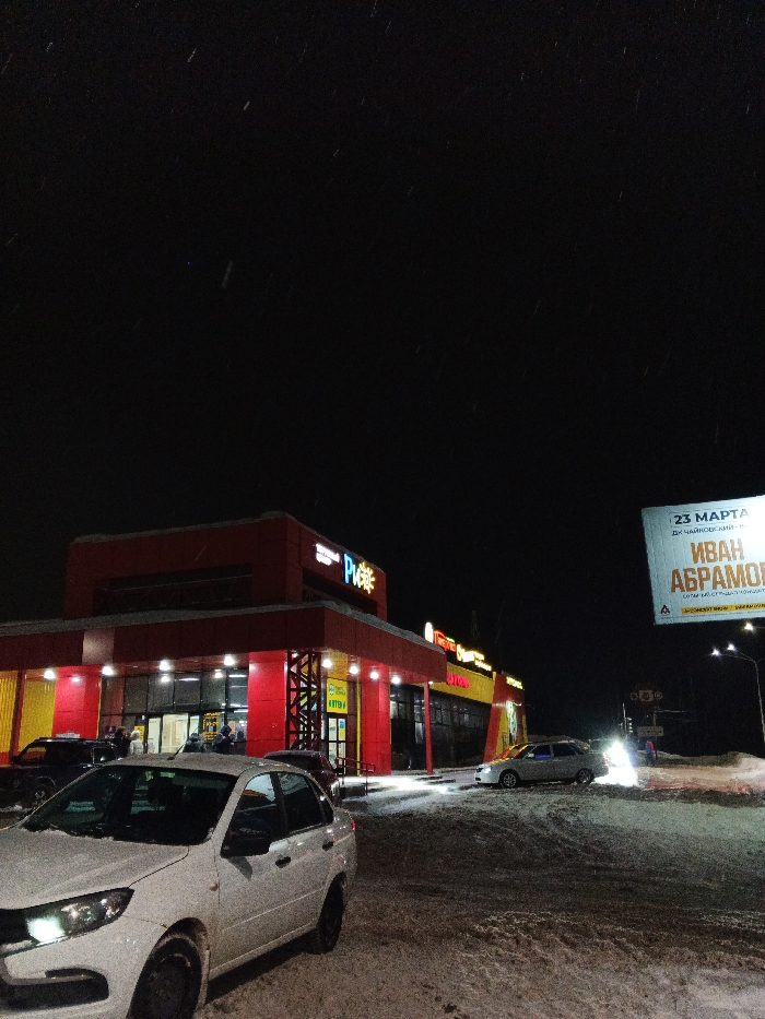 The image displays a nighttime winter scene in Chaikovsky, Russia, with visible light precipitation in the dark sky. A two-story commercial building with a red facade and yellow ground-level accents dominates the left-center. The building's large windows reveal interior lighting, and exterior lights illuminate its entrances. A prominent blue and white neon sign on the roof reads "РУСЬ" (Rus). A smaller green sign to the left shows "БИБЛИОТЕКА" (Library), and another to the right displays "Автозапчасти" (Auto parts). Several indistinct human figures are visible near the building's main entrance. In the foreground, a white sedan, partially covered in snow, is parked facing left. The ground is consistently covered with uneven snow and slush, indicating cold conditions. To the right of the building, a large, illuminated billboard displays text in Russian, including "23 МАРТА" (March 23), "ДЦ ЧАЙКОВСКИЙ" (DC Chaikovsky), and "ИВАН АБРАМОВ" (Ivan Abramov), advertising an event. A silver sedan is visible further to the right on a snow-covered roadway, with its headlights on. Streetlights are visible, illuminating the intersection area, and traffic signs are mounted on a pole near the billboard.