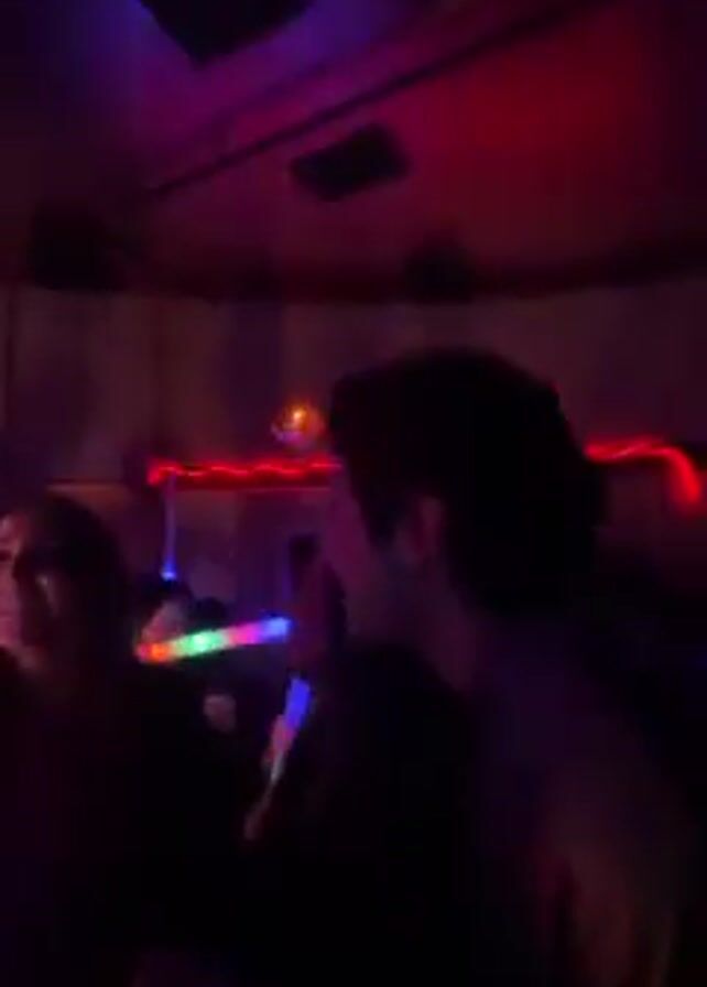 group of people dancing in a dimly lit space with multicolored lighting. The room is dark, illuminated by flashing red, blue, and green lights, and a disco ball hangs from the ceiling. Several individuals hold light sticks that emit various colors. The camera moves as if held by someone dancing with the group, capturing quick glimpses of people's faces and bodies. Some people are holding up their phones, seemingly recording the scene. The atmosphere is lively and energetic.