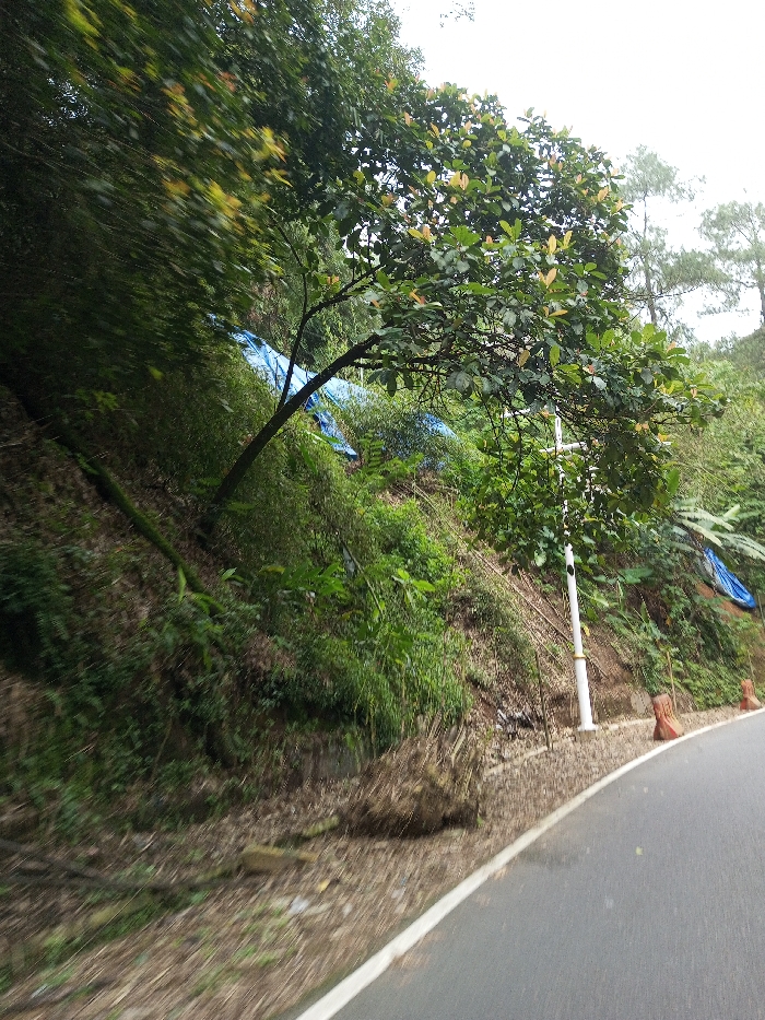 The image depicts a steep, heavily vegetated hillside adjacent to a paved road in Boommlog, Bhutan, viewed from a slightly low angle, indicating motion. The road, featuring a white edge line, occupies the lower right quadrant and appears damp. The hillside, rising sharply on the left, is covered in dense green foliage, including numerous trees and shrubs. A prominent tree with an arching dark trunk and light green/yellow new leaves is centrally located on the slope. Multiple sections of blue tarpaulin are visible on the hillside, partially obscured by vegetation, suggesting ground cover or temporary shelters. A white utility pole with a yellowish base band stands upright near the road edge on the right side of the slope. Further along the road edge to the right, two orange-brown, cone-shaped concrete road markers are visible. The immediate ground cover at the base of the slope consists of dirt, rocks, and dried foliage. The sky is overcast and visible through the tree canopy at the top. No individuals, animals, or active interactions are present.