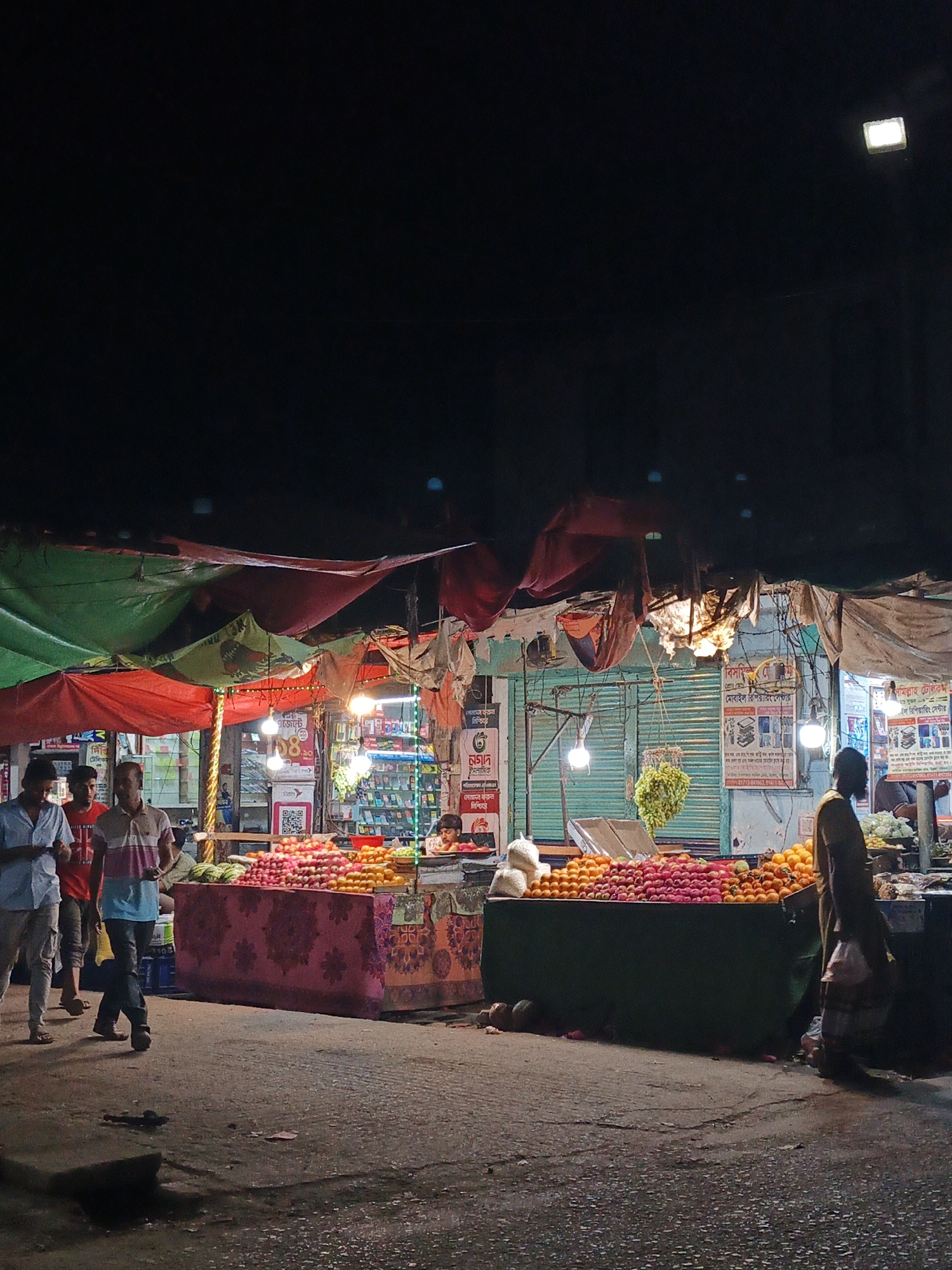 The image depicts a nighttime street market in Kauria, Bangladesh