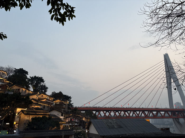The image captures an urban twilight scene in Nan'an District, China, featuring illuminated traditional-style architecture and a modern cable-stayed bridge. In the upper left foreground, dark green leaves from an unseen tree branch partially obscure the sky. In the upper right, bare, dark tree branches with fine twigs are silhouetted against the sky. A dark grey tiled roof of a building occupies the lower center-right foreground. The midground on the left displays a cluster of multi-story buildings constructed into a hillside. These structures feature dark, sloped roofs and light-colored walls, with many windows and exteriors emitting warm yellow light. Dense dark green foliage and occasional bare trees are visible between the buildings. Dominating the right midground is the Dongshuimen Bridge, a cable-stayed bridge characterized by a tall, light grey, inverted Y-shaped pylon on the right. Numerous dark cables extend from the pylon to the bridge deck. The bridge deck and its supporting truss structure are distinctly red, with a visible criss-cross pattern beneath the roadway. Small red lights are visible along the bridge deck's railing. The sky above presents a gradient, transitioning from pale blue at the top to a faint orange and grey near the horizon, consistent with dusk conditions. No individuals are visible in the frame.
