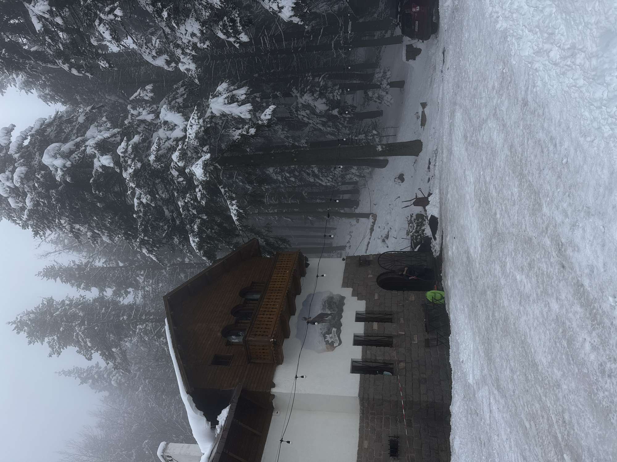 snow-covered landscape with a building in the foreground, possibly located in or near Sofia, Bulgaria, given the description. The building has a traditional Alpine or Central European architectural style, featuring a wooden upper section with a balcony and a stone or brick lower section. A mural depicting a deer is visible on the building's facade. The surrounding environment is heavily forested, with tall evergreen trees covered in snow. The ground is also covered in a thick layer of snow. There are faint lighting structures above ground, and a car is visible behind the building. A person in a bright green jacket and helmet can be seen next to the building.