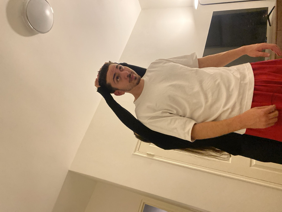 This image captures an interior residential room, likely an apartment, featuring two individuals. The specific location within New York, United States, is not discernible from the visual evidence. In the foreground, a young adult male stands, angled slightly to the viewer's right. He possesses short dark hair, short dark facial hair, and an upward and leftward gaze. He wears a white short-sleeved t-shirt and red athletic shorts. His hands rest at his sides. Positioned directly behind the male subject, a second individual, whose face is obscured, appears to be female, identifiable by visible long dark hair extending down her back. This individual wears a form-fitting, long-sleeved black garment, featuring visible fingerless glove or thumbhole designs at the cuffs. Her arms are raised, and her hands are placed with fingers spread across the top of the male subject's head. The male subject's head is tilted slightly as her hands interact with his hair. The room features light-colored walls and a matching ceiling, which includes a round, white flush-mount light fixture in the upper right quadrant. To the left, a white door frame and a partially visible white door are present. In the background to the right, a dark, low-profile credenza or media console supports a large, unlit television screen. A slender, modern floor lamp with a circular light source is also visible on the far right. The environment is uniformly illuminated by artificial light.