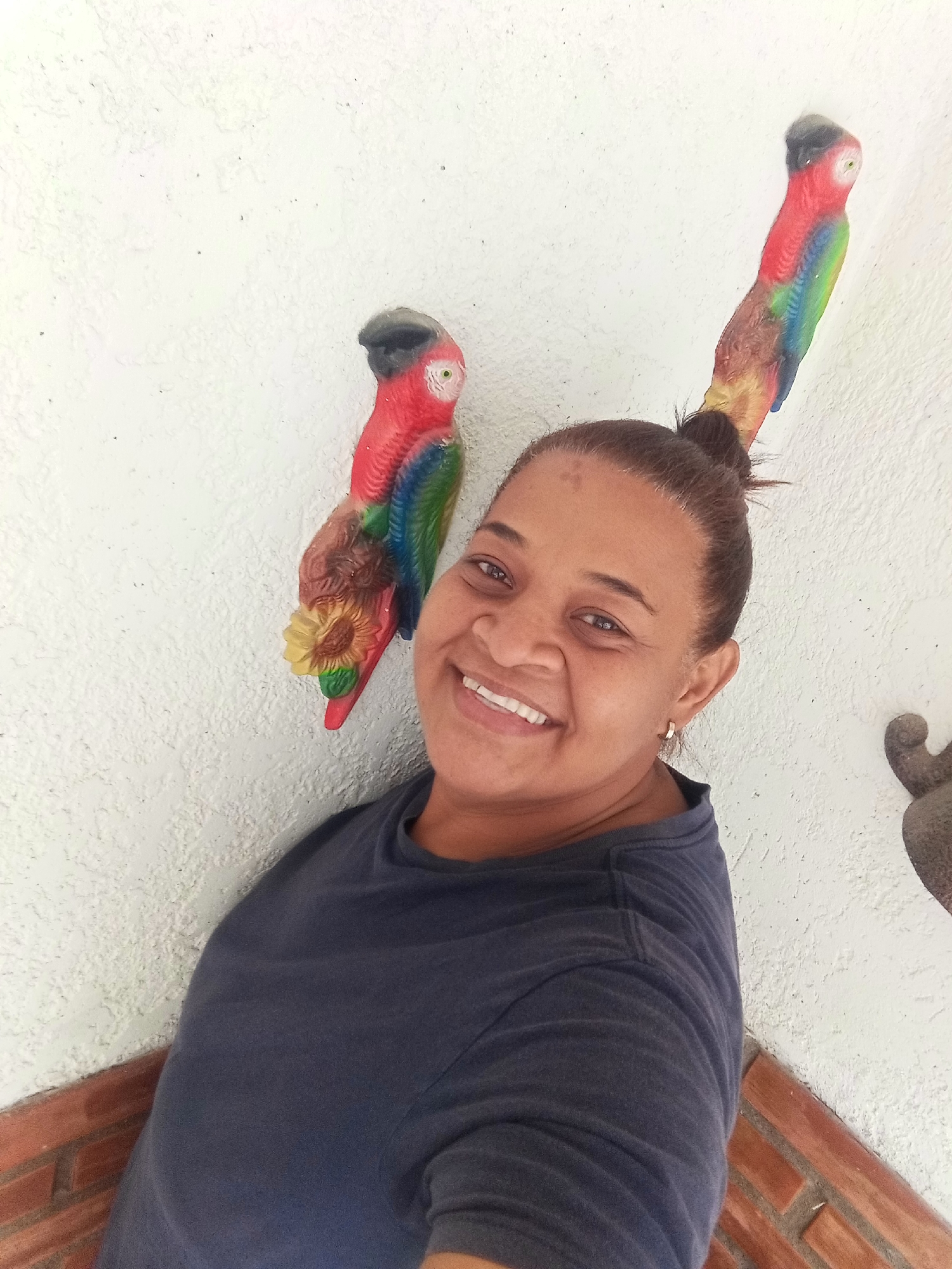 smiling woman in a dark blue t-shirt standing in front of a white textured wall. Two colorful parrot decorations are attached to the wall behind her. The woman's hair is pulled back in a bun. The bottom of the image shows a brick border. There is no definitive indication of the location as Las Tejerías, Venezuela.
