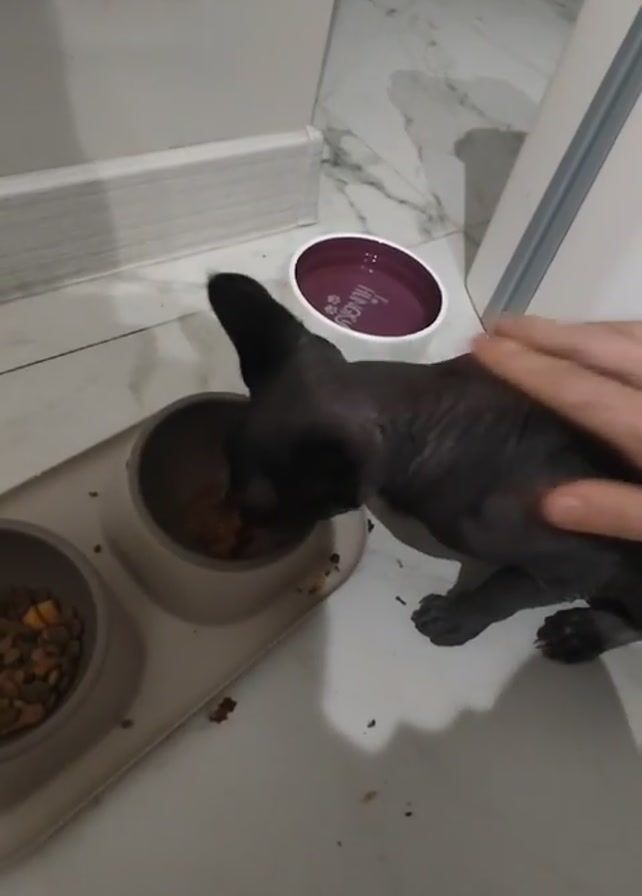 A close-up shows a gray sphynx cat eating food from a beige double-dish on a white tiled floor