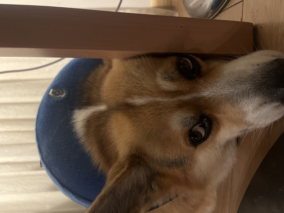 A close-up shot depicts a tan and white dog with large, dark eyes looking upward. The dog is wearing a blue, padded Elizabethan collar. A wooden table leg is positioned above the dog's head, partially obscuring the view. The dog's face fills most of the frame, with the collar and table leg occupying the remaining space. The background consists of a wooden floor and beige wall.