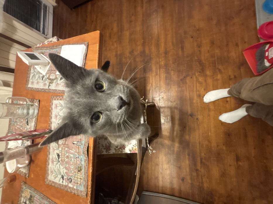 This image depicts an indoor domestic scene, stated to be located in Sofia, Bulgaria. A grey-furred cat, likely a Russian Blue type, is central in the frame, looking directly into the camera with wide green-yellow eyes and prominent pointed ears. Its front paws rest on a dark wooden chair frame with a visible floral patterned cushion, placing the cat at a low perspective relative to the camera. In the upper half of the image, a reddish-brown wooden dining table is partially visible, set with multiple light-colored placemats adorned with intricate patterns of birds and stylized landscapes. Objects on the table include a clear glass mug, a white ceramic mug, a metal and clear salt/pepper grinder, white paper napkins, and a small white digital display device. The floor beneath the table is composed of polished dark wooden planks exhibiting various tones and textures. In the lower right portion of the frame, a pair of human feet, wearing white socks and brown trousers, are visible. Adjacent to the human feet on the wooden floor are a red dustpan containing a black brush and a single pink slipper. The background, behind the table, shows white wall paneling and a window fitted with horizontal blinds.