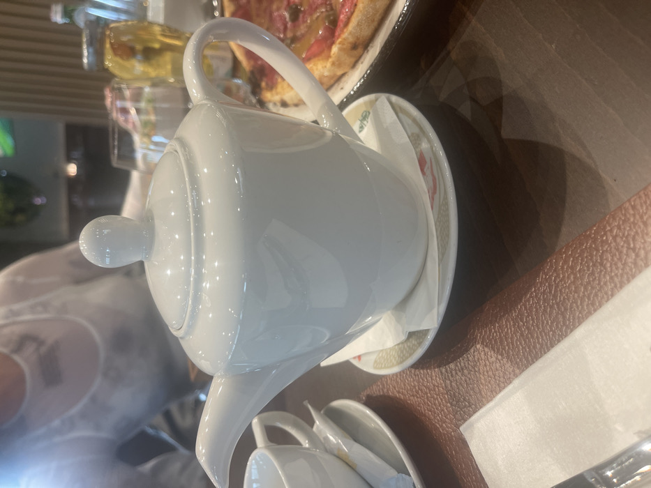 The image displays an indoor dining scene, specifically a table setting, in Dub, Montenegro. A prominent white ceramic teapot with a matching lid is centrally positioned, resting on a white saucer and a small white paper napkin. To the immediate left, a portion of a white teacup and its accompanying saucer are visible, with small white paper sachets placed on the saucer. The table surface is a textured brown. In the background to the right, a plate holds a partially consumed pizza with visible crust and toppings. Behind the pizza, a clear glass bottle containing a yellow liquid and a clear drinking glass are present. A person, indistinct and out of focus, is partially visible in the upper left background, wearing a light-colored, possibly translucent, long-sleeved top over a darker undergarment. The background environment features vertical paneled walls and some blurred green foliage, suggesting a cafe or restaurant interior with ambient lighting.