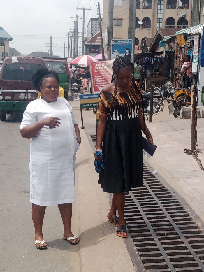 The image portrays an urban street scene in Umuode, Nigeria, under overcast daylight