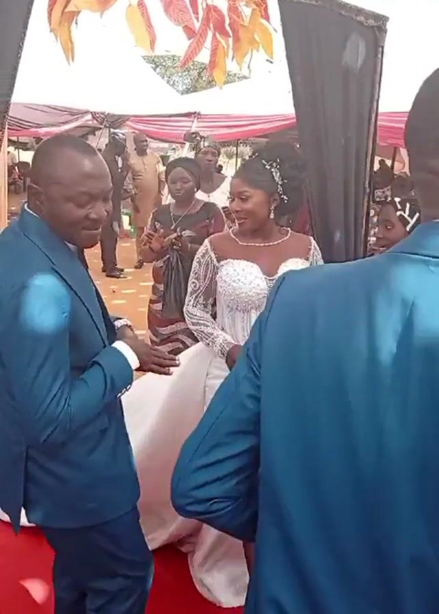 bride and groom at their wedding, walking on a red carpet under an awning decorated with artificial leaves. The bride wears a white, long-sleeved gown with intricate embroidery. The groom wears a blue suit with a bow tie and smiles as he moves. They are surrounded by guests, and the person filming is standing close to them, also wearing a blue suit. A young child in a red shirt walks past the couple.