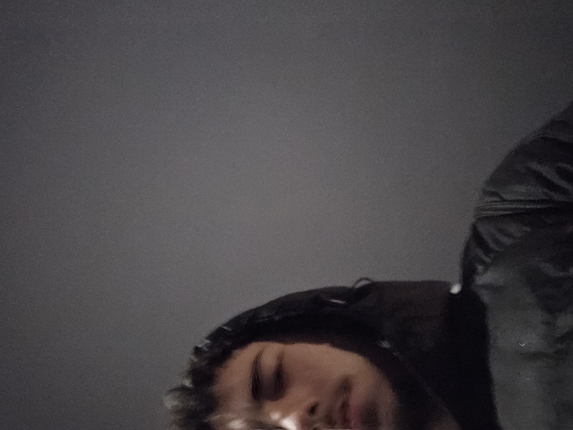 A dimly lit close-up shot depicts a person's face partially obscured by a black hooded jacket. The person's eyes are closed, and their mouth is slightly open. The background is a uniform, dark gray. The person's face and jacket occupy the lower and right portions of the frame, leaving the upper portion dominated by the gray background. The location is unknown.