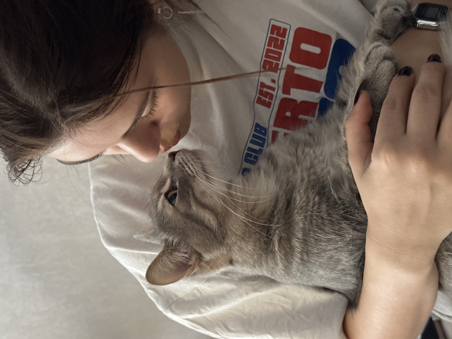 The scene depicts an indoor interaction between an individual and a domestic cat
