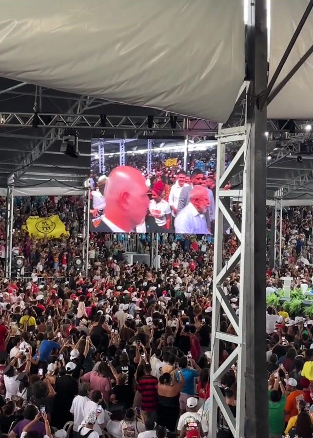 A large crowd is seen at a political rally under a large tent structure. The crowd, densely packed, is predominantly wearing red or white attire, and many individuals are holding up their phones, presumably to record or photograph the event. A large screen displays an image of what appears to be a politician, likely the central figure of the rally, visible amongst other people. The tent is supported by white metal structures, providing a stark contrast to the colorful crowd and the vibrant images on the screen. The atmosphere seems energetic and celebratory, indicated by the size of the crowd and the focus on the screen.