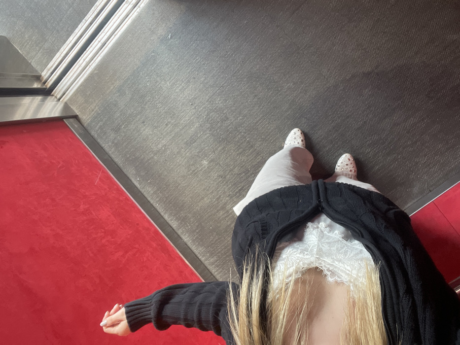 The image depicts a high-angle view inside what appears to be an elevator or enclosed space with sliding doors. One individual is partially visible, from the upper torso to the feet. The person has blonde hair and is wearing a white lace-trimmed top, a black knitted long-sleeved shrug or cardigan, and a light-colored skirt or dress. White, studded, pointed-toe flat shoes are on their feet. The left arm is bent, with the hand partially visible, showing light-colored nail polish. The floor is dark gray and textured, possibly carpet. To the left, a bright red, textured wall is visible, bordered by a metallic trim. To the right, a metallic door frame with visible tracks for a sliding door mechanism is present. The exact location within Miami, United States of America, is not discernible from the provided visual information.