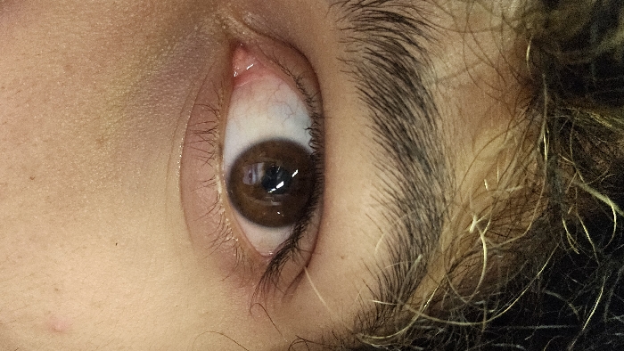 A close-up image shows a brown human eye, including the iris, pupil, and surrounding sclera. The eyelids, lashes, and eyebrow are also visible. Some strands of hair are present near the eyebrow and temple area. The skin surrounding the eye is visible, displaying texture and complexion variations.