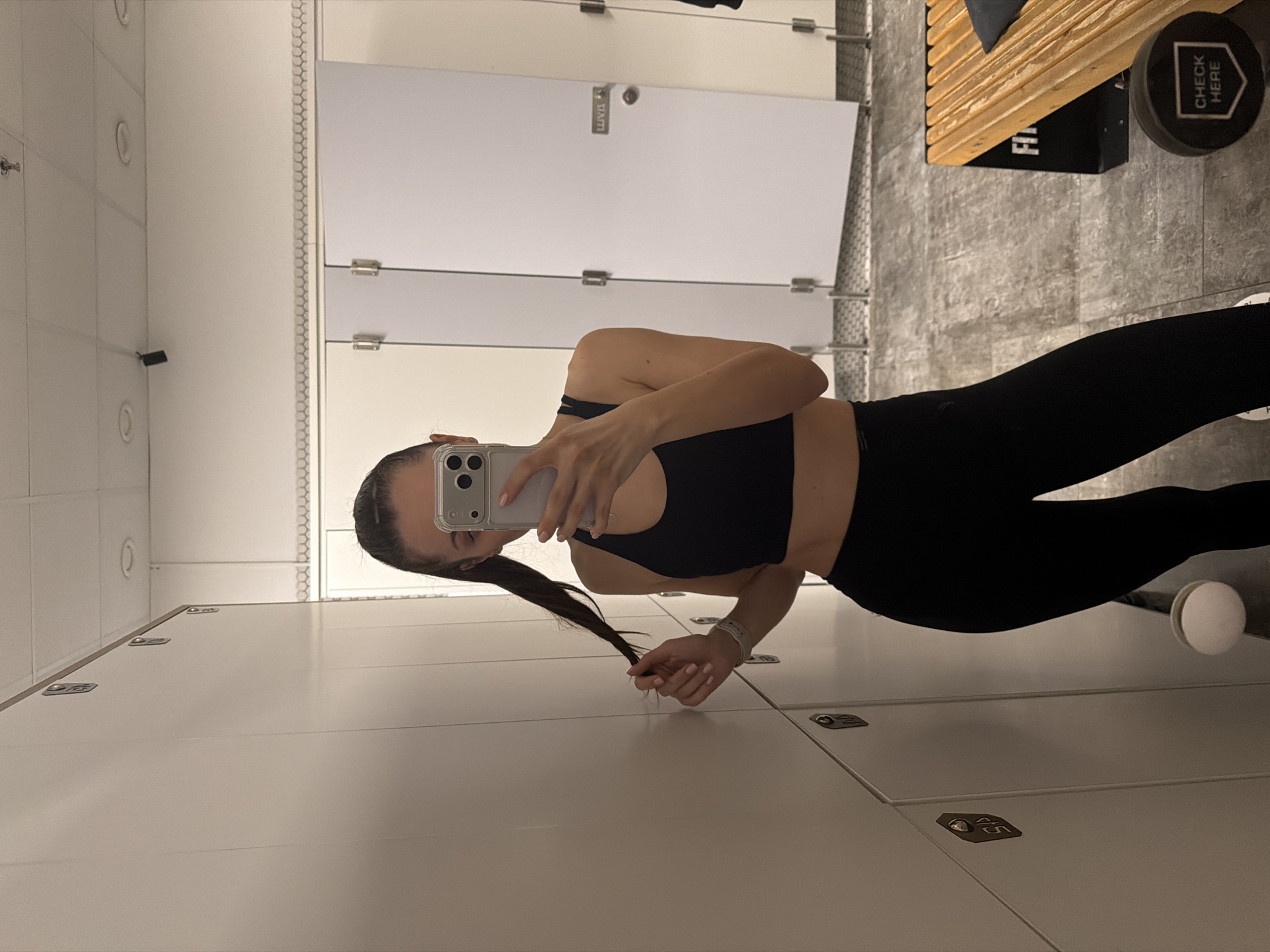 A woman is taking a mirror selfie in what appears to be a gym locker room. She is wearing a black sports bra and black leggings. The locker room features white lockers and changing stalls. In the background, there is gym equipment. The location is likely a gym in Varna, Bulgaria, but that cannot be confirmed from the image.