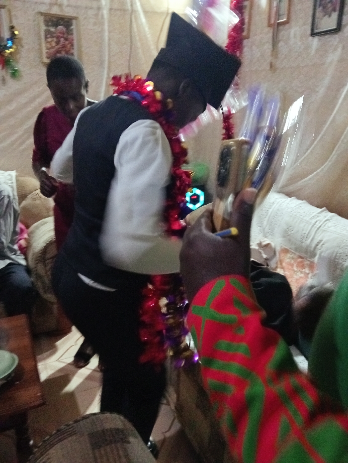 A person wearing a graduation cap and a festive garland bows slightly, possibly receiving an award. Another person stands behind them, their attention directed downwards. In the foreground, a hand holds several objects, potentially pens or markers. The setting seems informal, possibly indoors with furniture and decorations visible in the background. One individual wears a red and green patterned sleeve.