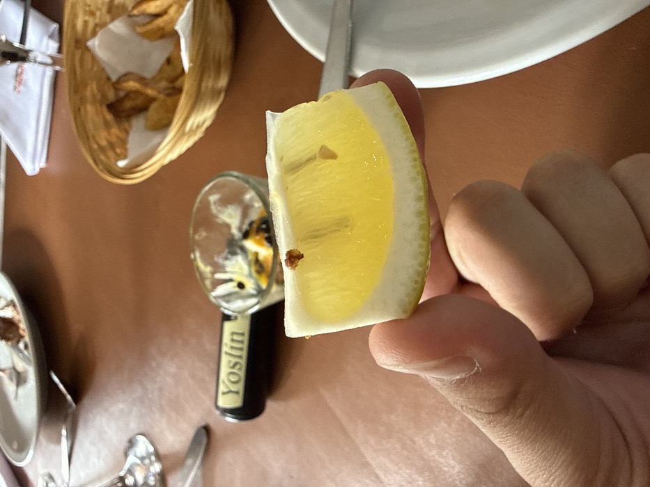 - "A hand holds a slice of lemon against a restaurant table" by FM-uidZr2, licensed under CC BY 4.0