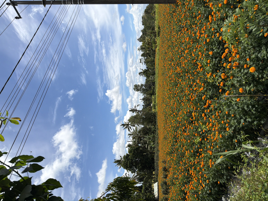 - "An expansive field bursts with vibrant orange flowers, likely marigolds, stretching towards a treeline with palm trees" by FM-ytW0x1, licensed under CC BY 4.0