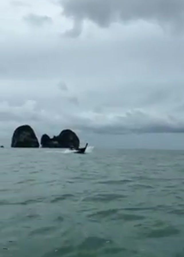 The video depicts a seascape under a cloudy sky. Several limestone islands or rock formations punctuate the horizon. A longtail boat is seen cutting through the water, moving away from the camera, and eventually disappearing into the distance. The water surface is choppy.
