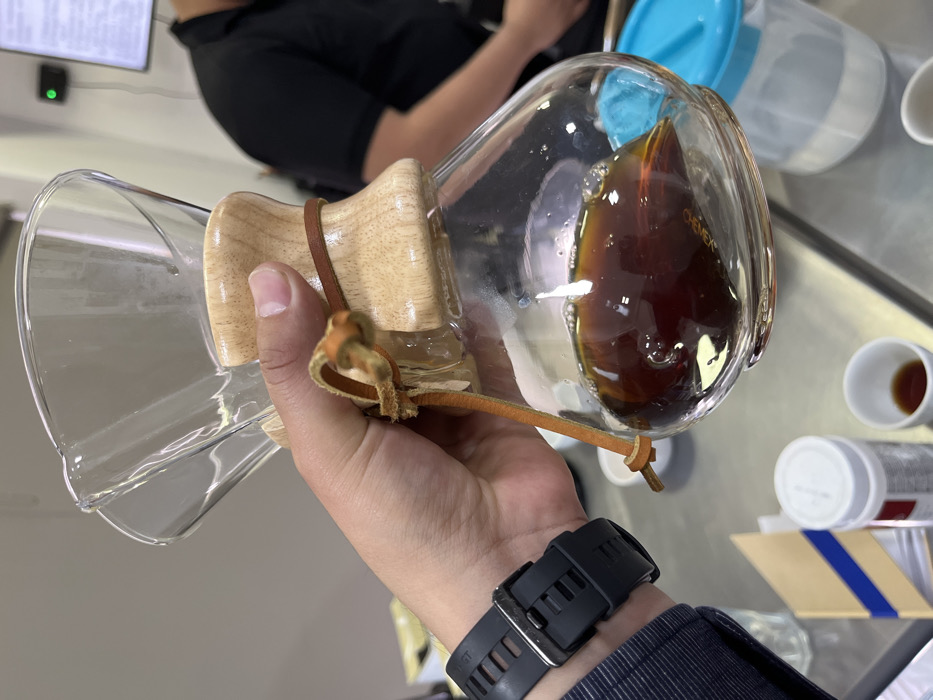 A person holds a Chemex coffee maker filled with dark brewed coffee. The glass carafe has a wooden handle secured with a leather tie. The individual wears a black smartwatch. The setting appears to be a kitchen or laboratory countertop with other items like cups, containers, and papers scattered nearby. Another person is partially visible in the background.