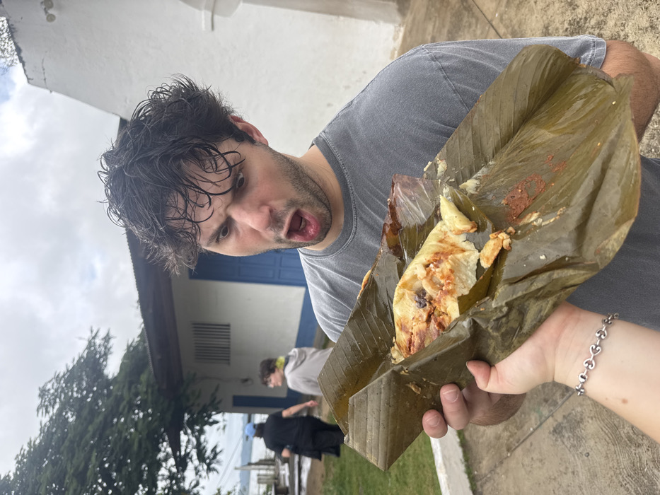 The image presents a street scene in Flores, Guatemala, under an overcast sky. In the foreground, a male individual with dark, disheveled hair and a grey t-shirt exhibits a dramatic facial expression, with wide eyes and an open mouth, directed towards a large food item. This food item, consistent with a tamal, is partially unwrapped from its dark green banana leaf packaging, revealing a light-colored masa with reddish sauce and darker embedded components. The food is held by an unseen individual's left hand, adorned with a silver-colored bracelet featuring heart-shaped links. In the mid-ground, to the left, a white building with blue doors and window grates, topped with a corrugated metal roof, is partially visible behind a large, leafy tree. Beyond this, a body of water is discernible. Two additional individuals are walking away from the camera in the background near the water, one wearing dark attire and a blue cap, and the other in a light-colored hooded sweatshirt. To the right of the primary subject, a section of a white stucco building with a rounded architectural element is visible. The ground in the immediate foreground is paved with concrete or stone, transitioning to grass further back.