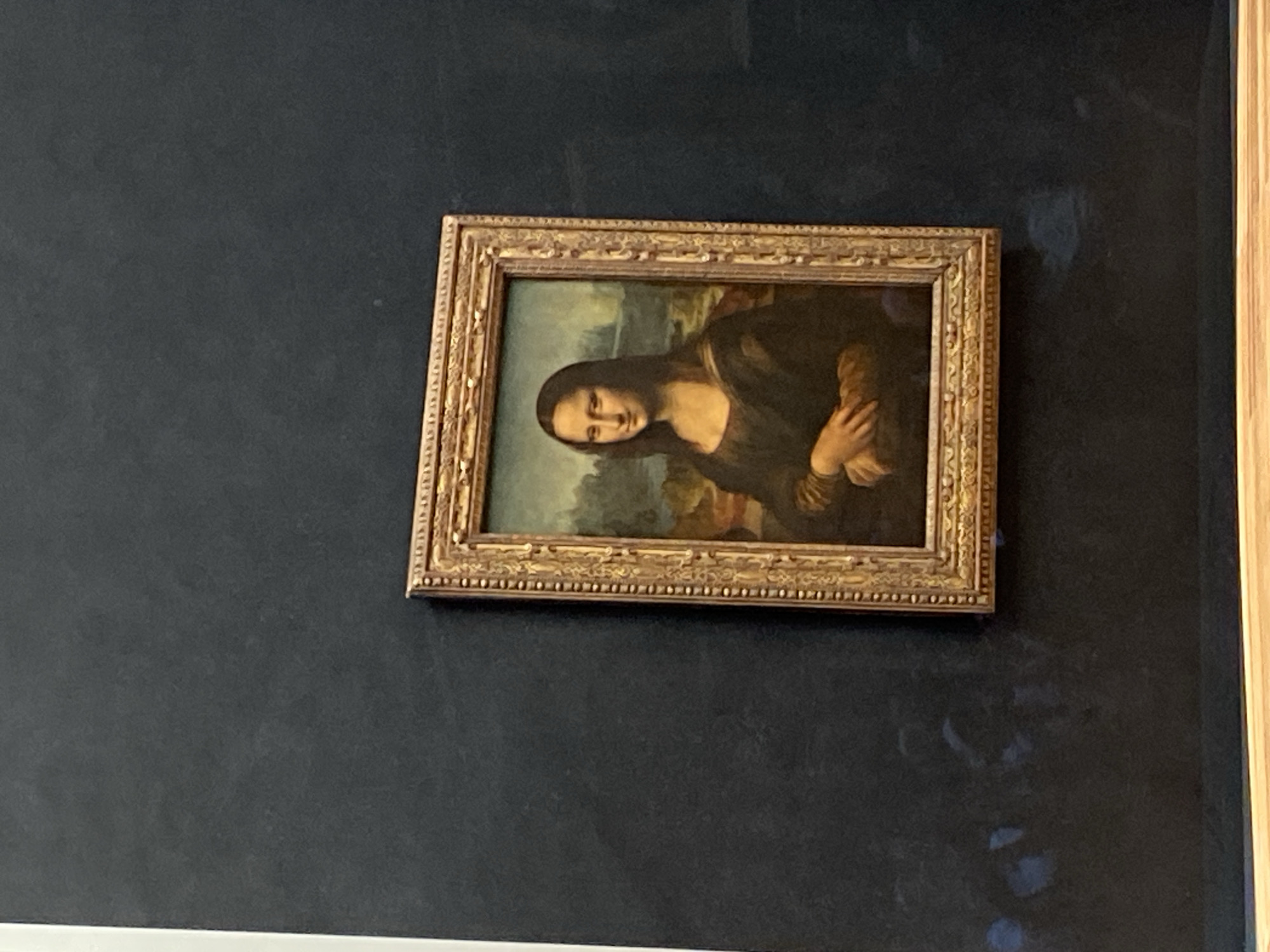 The image is of a framed reproduction of Leonardo da Vinci's Mona Lisa hanging on a dark wall