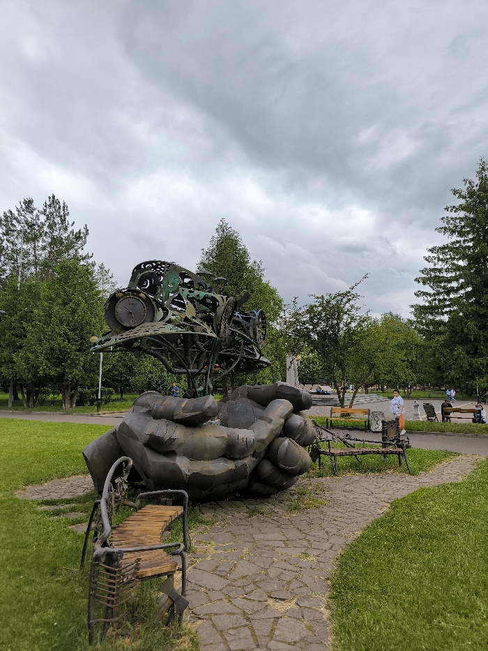A park scene under a cloudy sky. A large metal sculpture resembling a hand holding an intricate train engine is the focal point. Benches surround the statue, and people are relaxing nearby. The ground is paved with stone pathways, with green grass and trees filling the background. The metal benches appear to be integrated with the sculpture's design.