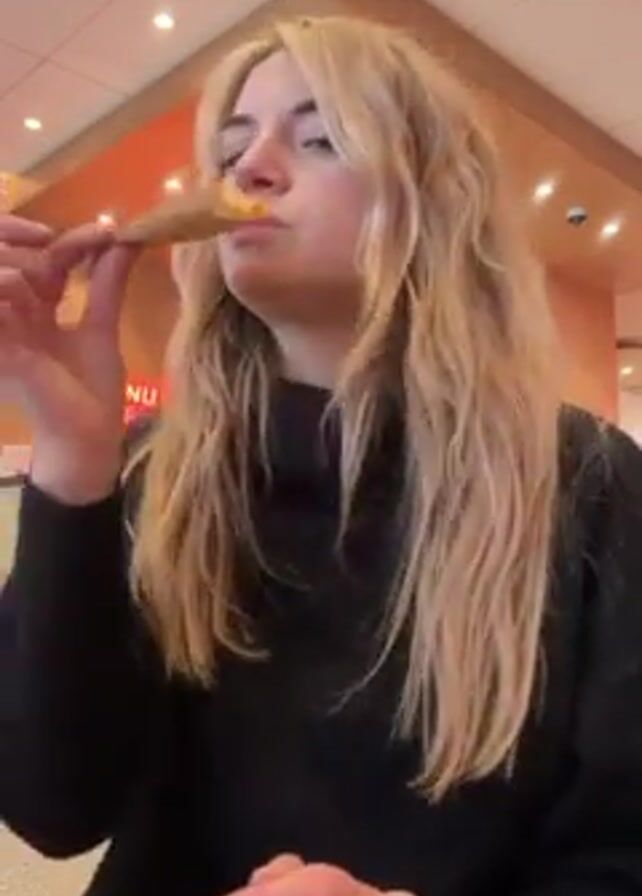 A young woman with light brown hair wearing a black sweater is sitting inside what appears to be a restaurant. She takes a bite of a rectangular piece of food and then holds it up with both hands, looking at it and then eating it again. There's a sign on the wall behind her, and the interior of the restaurant is visible, with ceiling lights and decorative elements.