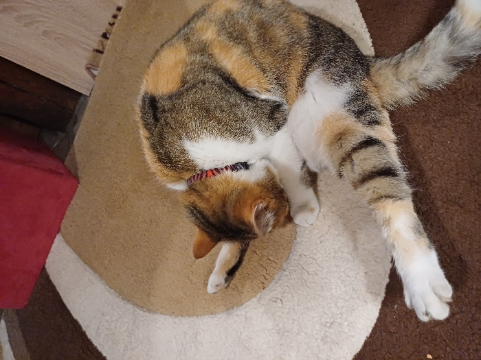 The scene is an interior residential space in Dolna Oryahovitsa, Bulgaria. A domestic short-haired cat, exhibiting a calico coat pattern with white, orange/ginger, and tabby-striped brown/black fur, is positioned on a two-toned area rug. The cat is wearing a red and black patterned collar. It is observed in a curled posture, with its head lowered and turned towards its flank, appearing to groom itself. Its front left paw is extended, resting on the cream-colored section of the rug, while its right hind leg is tucked. The rug features a cream/beige central area bordered by a darker brown. In the upper background, a red upholstered object, consistent with a cushion or ottoman, is visible, alongside a light-colored wooden surface or furniture component.