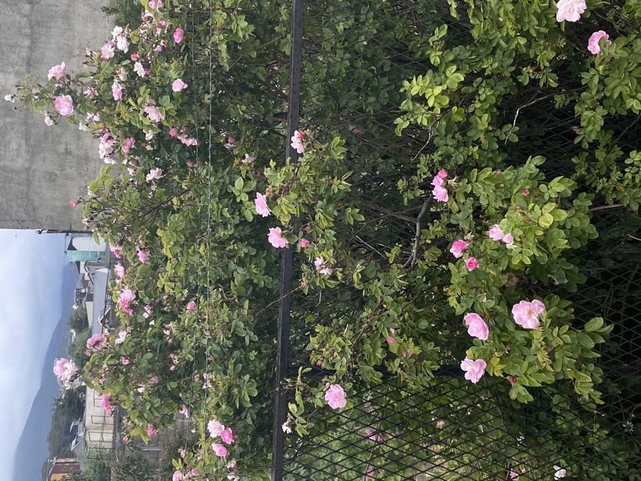 - "A lush rose bush with light pink blooms climbs a dark metal fence" by FM-S01i13, licensed under CC BY 4.0
