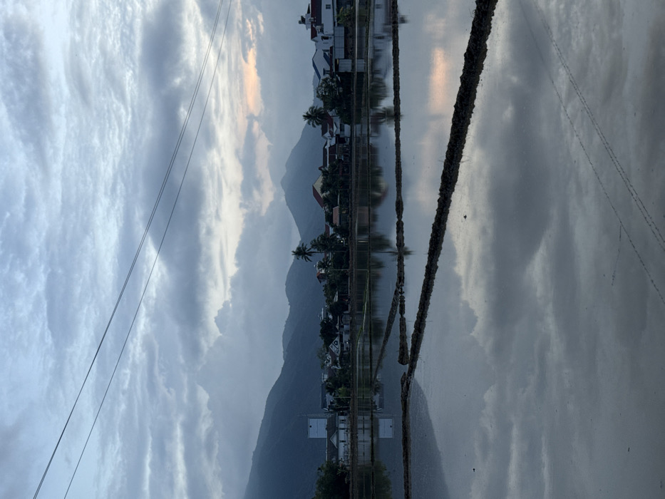 The image depicts a rural-urban transitional landscape in Diên Khánh, Vietnam, under an overcast sky at dawn or dusk. The foreground is dominated by a large, shallowly flooded field, likely a rice paddy, segmented by narrow, dark earthen ridges. The water's surface acts as a mirror, reflecting the cloudy sky above, which shows patches of muted orange and pink hues indicative of sunrise or sunset, along with the distant mountains and structures. In the midground, beyond the flooded field, a row of residential or mixed-use buildings with varying architectural styles and roof colors (red, white, blue) is visible. These structures are interspersed with numerous palm trees and other foliage. A white multi-story building is prominent on the left side of this row. The background features a range of undulating mountains, appearing dark and hazy against the lighter sky, suggesting distance and atmospheric conditions. Overhead power lines or utility cables stretch diagonally across the upper portion of the frame, from left to right, and their faint reflections are also present in the water. No individuals or specific actions are discernible within the scene.