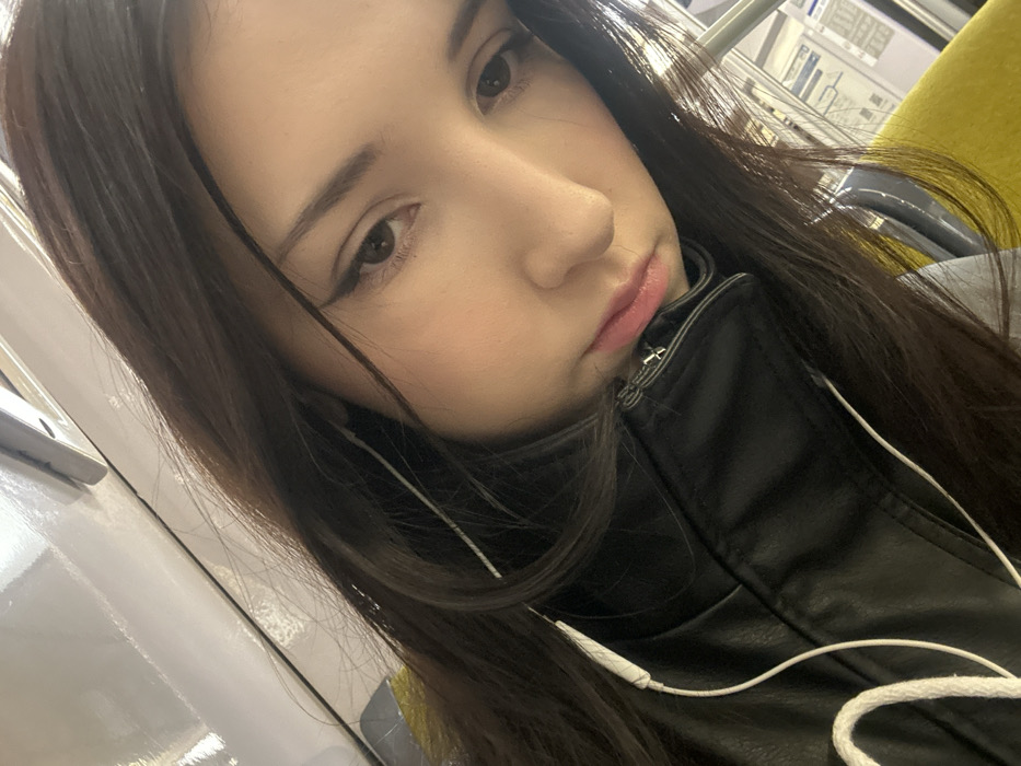 A young woman takes a selfie. She has dark hair and fair skin. Her makeup includes eyeliner. She wears a black, leather-like jacket zipped to the collarbone. White wired headphones are tangled around the jacket. She has a slightly pouty expression. The background appears to be the interior of public transportation with white and yellow surfaces visible.