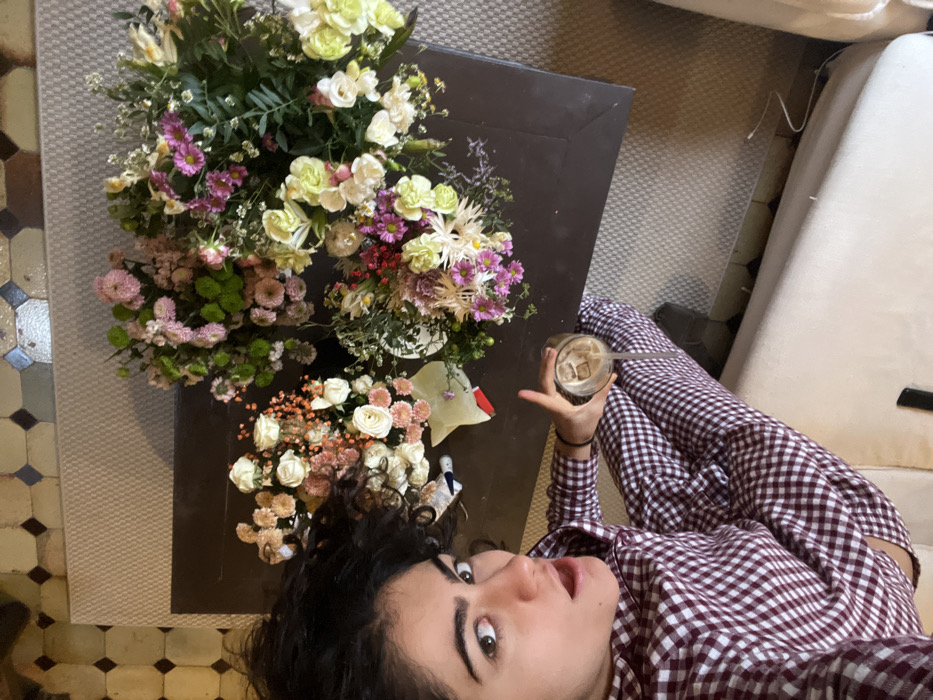 An overhead-angle interior photograph captures a young woman seated beside a coffee table filled with multiple floral arrangements