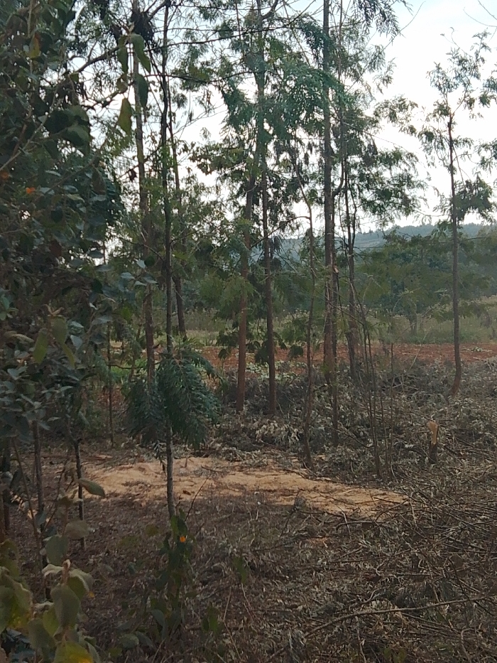 The image captures a rural outdoor scene in Ndeiya, Kenya, characterized by significant tree growth and evidence of recent land disturbance