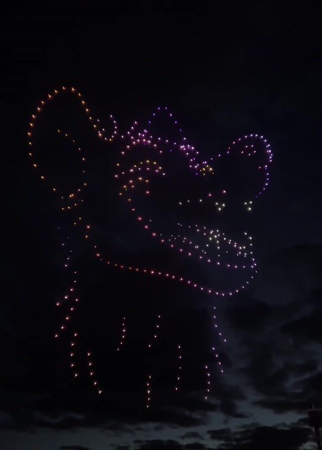 A drone show in the night sky depicts the silhouette of a smiling lion