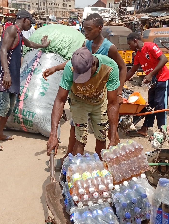 A bustling outdoor market scene depicts three men handling goods. One steadies a large green sack labeled "750KG," while another, in a green t-shirt and cap, maneuvers a cart loaded with wrapped water bottles. A third man in a red soccer jersey stands near a wheelbarrow filled with red peppers. The background includes buildings, vehicles, and other individuals, creating a vibrant, active atmosphere.