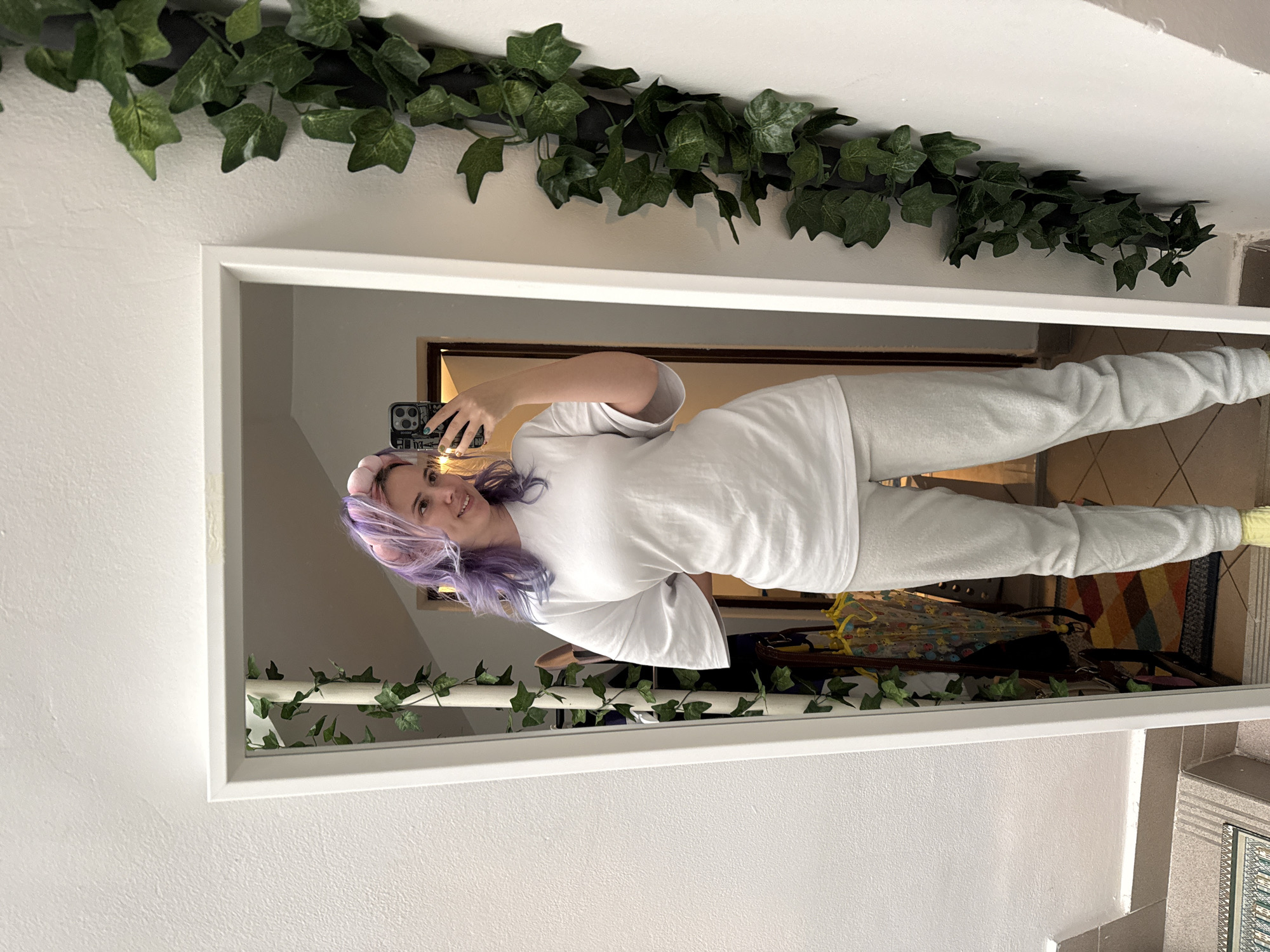 A woman with purple hair and a pink headband takes a photo of herself in a mirror. She is wearing a white shirt and grey sweatpants. The mirror is decorated with artificial ivy on the top and bottom. The room reflected in the mirror contains a hallway with a patterned rug, an umbrella, and a suitcase. The location appears to be indoors. There is no indication that this scene is in the city of City of Zagreb, Croatia.