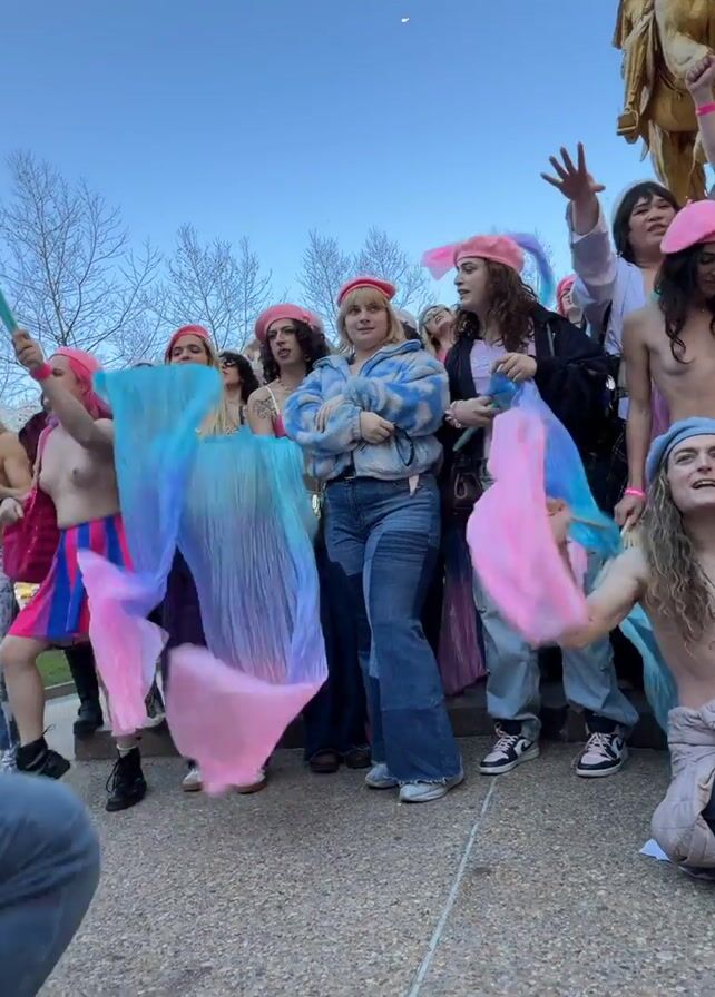 A group of women is shown in an outdoor setting. Some are standing, holding pink and blue flags and signs. Others are kneeling. A few of the women are topless, with their bare chests visible. The women are chanting. A man holding a phone is filming the group. The scene is bright and sunny. Buildings can be seen in the background.