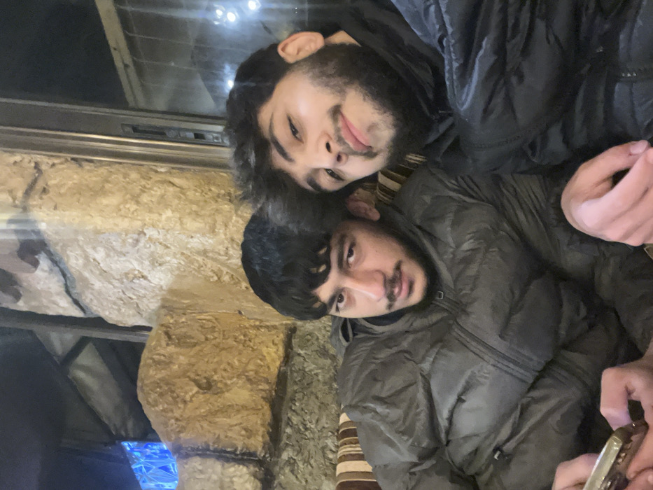 Two young men pose closely together in a selfie. Both wear puffy jackets, one black and one olive green. The man in black has a beard and longer hair. His companion has shorter hair and a mustache. They appear to be indoors, with stone walls and ceiling structures visible in the background. A phone is partly visible in the lower right corner, presumably used to take the photo. The overall setting appears casual and relaxed.