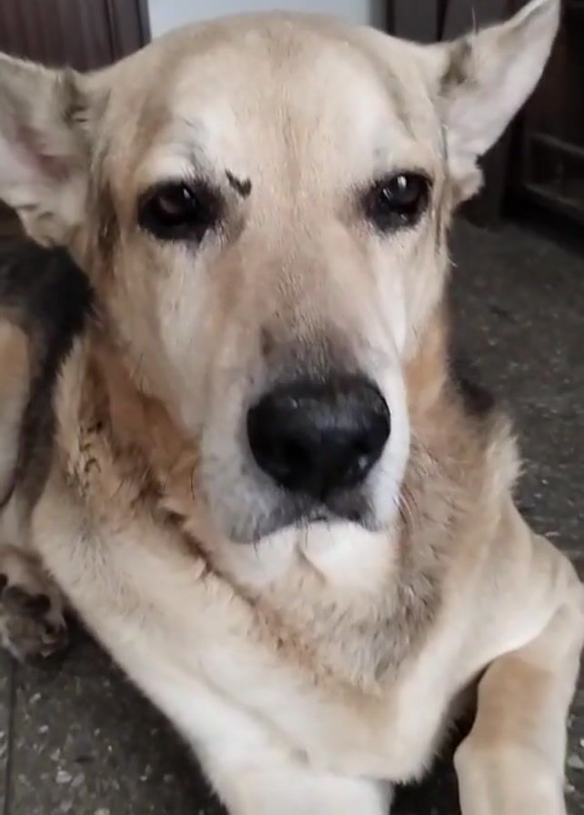 A close-up, low-angle shot features a light brown dog lying on what appears to be a speckled gray floor. The dog's head and upper body are in focus, with its front paws crossed. The dog's eyes are dark and its nose is black. A small, dark mark is visible above the dog's left eye, resembling an eyebrow. The dog's ears are perked up. The background includes a dark brown door on the left and a wooden cabinet or bookshelf on the right, partially obscured by shadow. The video is slightly shaky. The dog is looking off to the right.